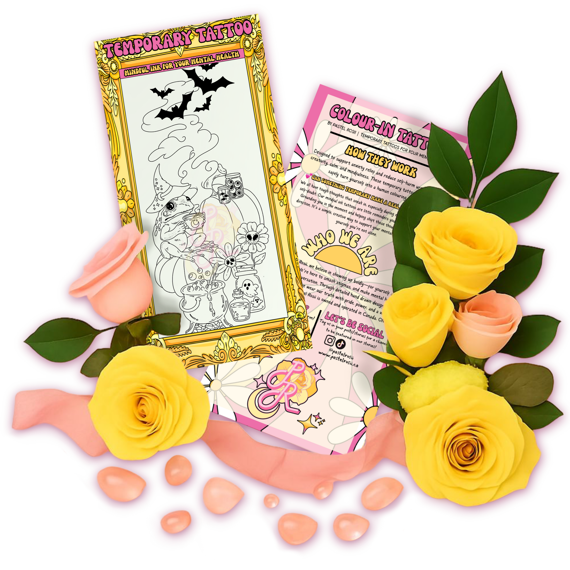 Mindful Ink by Pastel Rosii is a line of interactive, colour-in temporary tattoos designed for retailers seeking meaningful, wellness-focused products. These tattoos offer customers a creative and grounding activity that supports emotional regulation and mindful self-care.