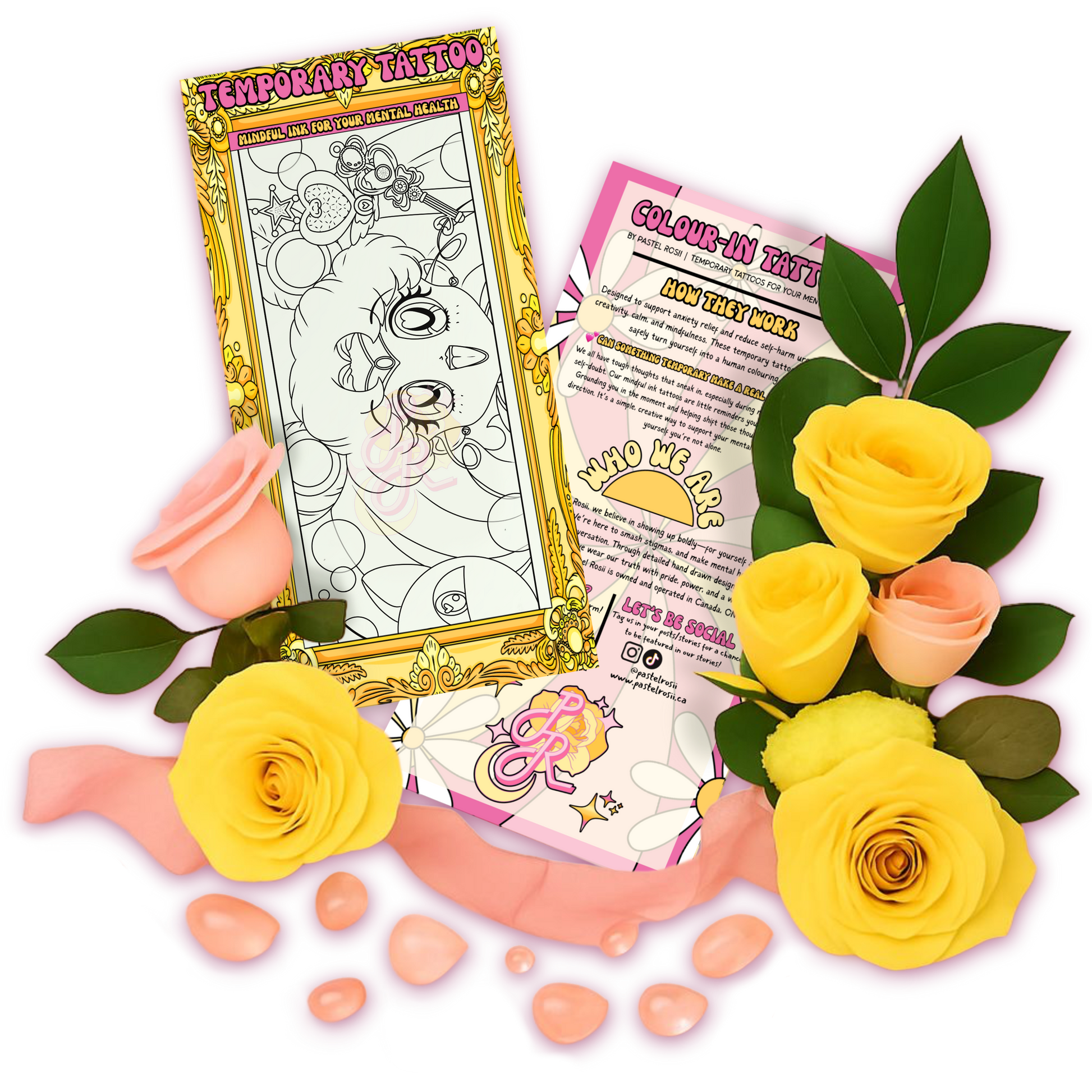 Mindful Ink by Pastel Rosii is a line of interactive, colour-in temporary tattoos designed for retailers seeking meaningful, wellness-focused products. These tattoos offer customers a creative and grounding activity that supports emotional regulation and mindful self-care.